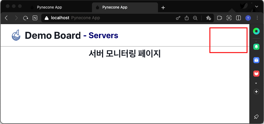 사용자 등록 후 로그인이 정상적으로 되면, Navigation Bar 오른쪽 상단에(붉은 사각형 영역) 로그인 사용자 정보, 다른 페이지 이동 및 로그아웃을 포함 하는 메뉴를 추가해보겠습니다.