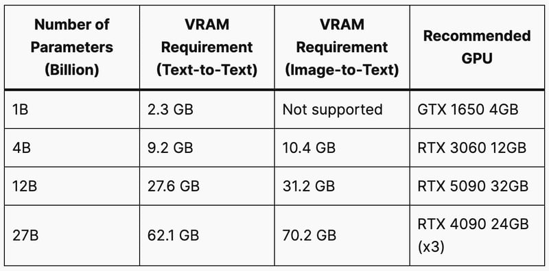 * **Recommended GPU:** This column lists the recommended GPU based on the VRAM requirement.
