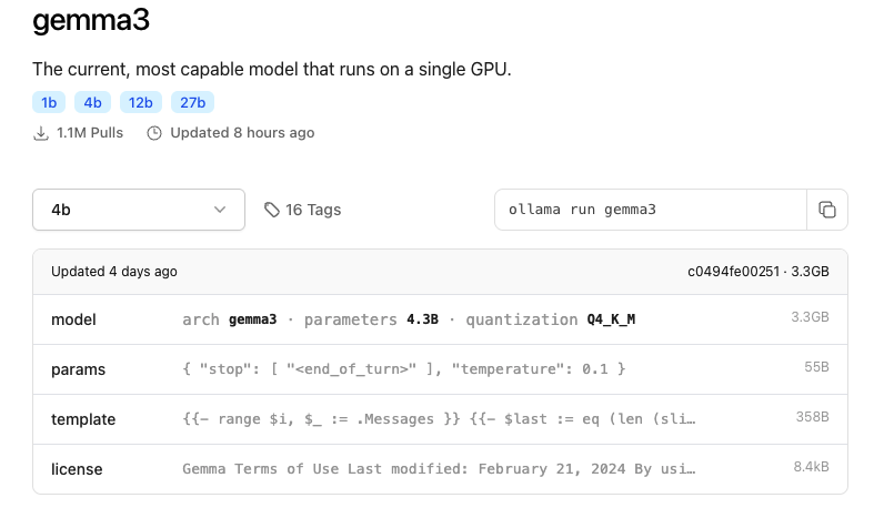 Default 모델은 4B 모델이고 1B는 text 이고 4B 사이즈부터 Multimodal 모델입니다. 4B 모델을 받습니다.