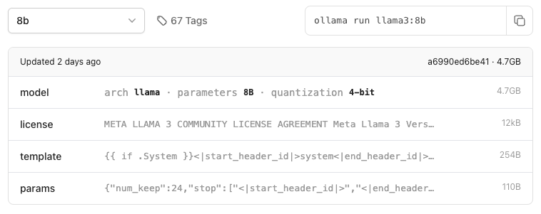 llama3:8b a6990ed6be41 4.7 GB About a minute ago