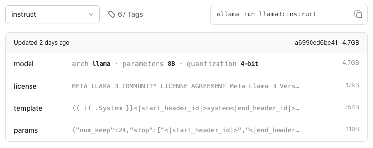 llama3:instruct a6990ed6be41 4.7 GB About a minute ago